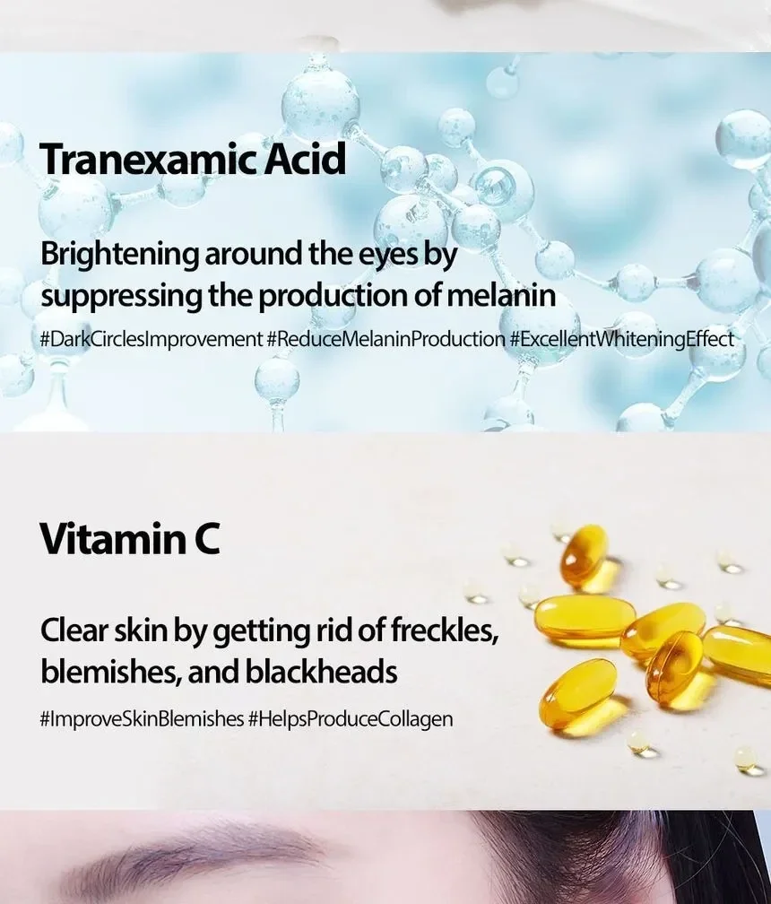 - Tranexaminezuur + Glutathion – Verminderen donkere kringen en egaliseren de teint.